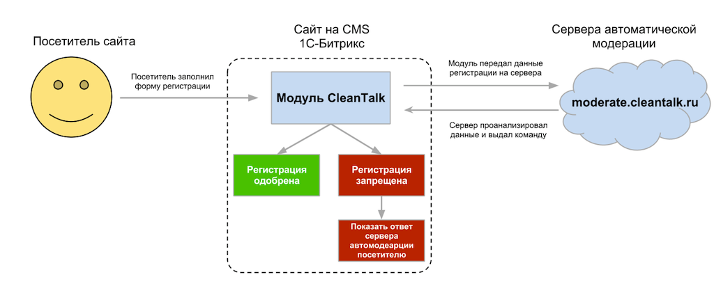 Сервер проверяет Email, IP и Nickname нового пользователя в черных списках, анализирует продолжительность времени заполнения формы регистрации. По завершению всех необходимых проверок сервер отправляет команду на сайт - запретить или разрешить регистрацию пользователя.